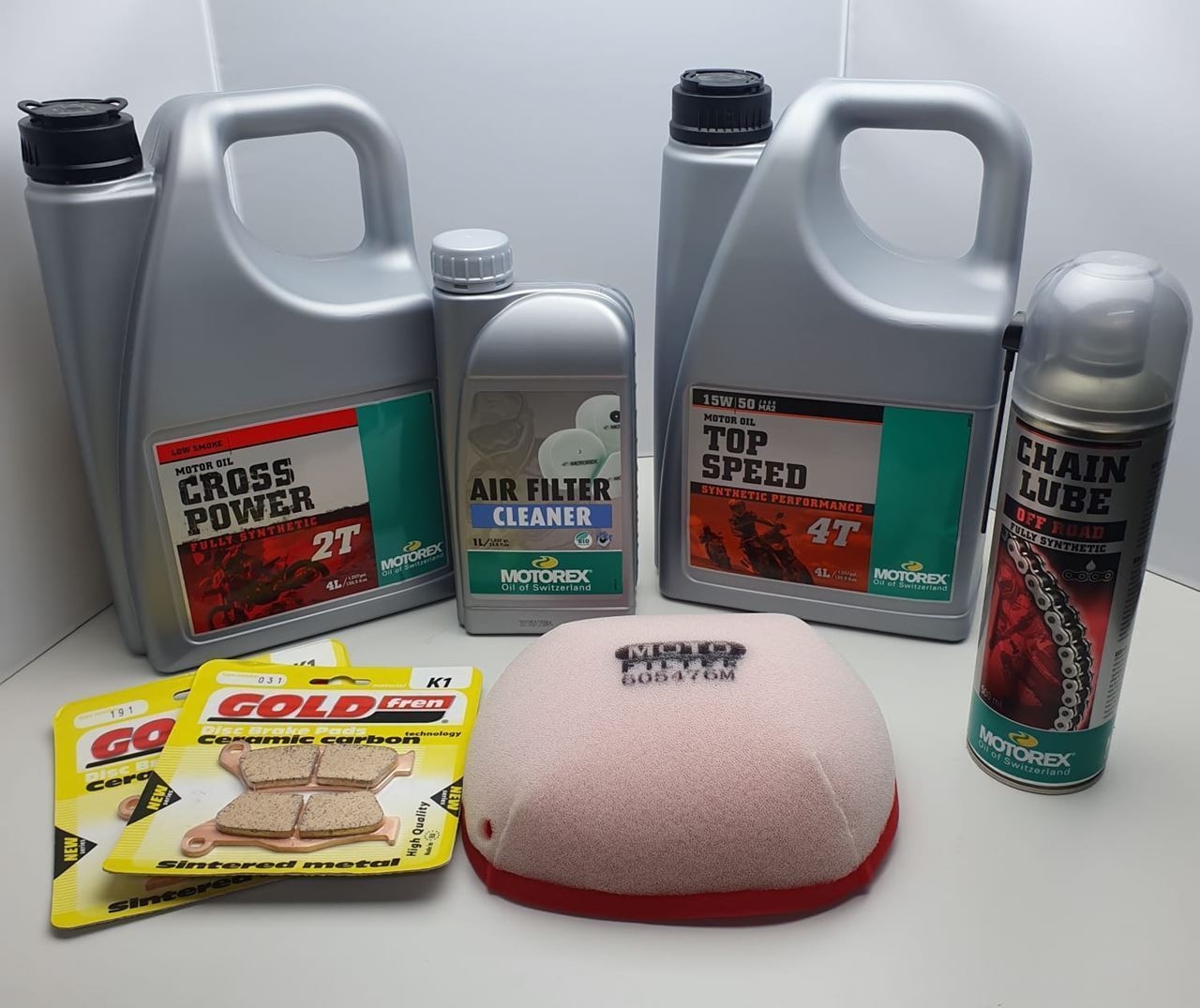 4l Cross Power 2T 4l Top Speed 15/50 1l Air Cleaner Front Brake Pads Rear Brake Pads Motorex chain Lube Air Filter
